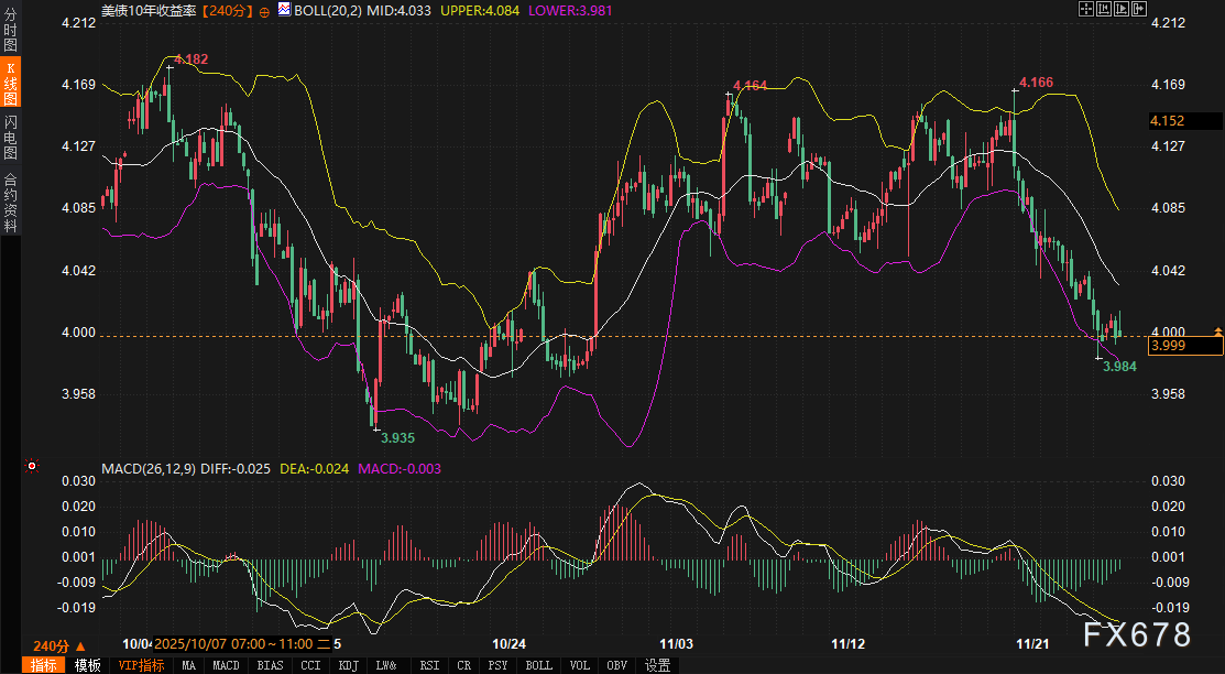 10年期美债收益率近期反复测试4%心理关口,技术面显示其布林带(20,2)中轨位于4.033%,上轨与下轨分别报4.085%和3.981%,形成明确的震荡区间。MACD指标中DIFF与DEA值分别为-0.025和-0.024,接近零轴下方死叉,暗示短期下行动能尚未完全释放。尽管收益率一度跌破4%,但卖盘在3.99%附近持续介入,表明市场对收益率进一步下行的共识有限。