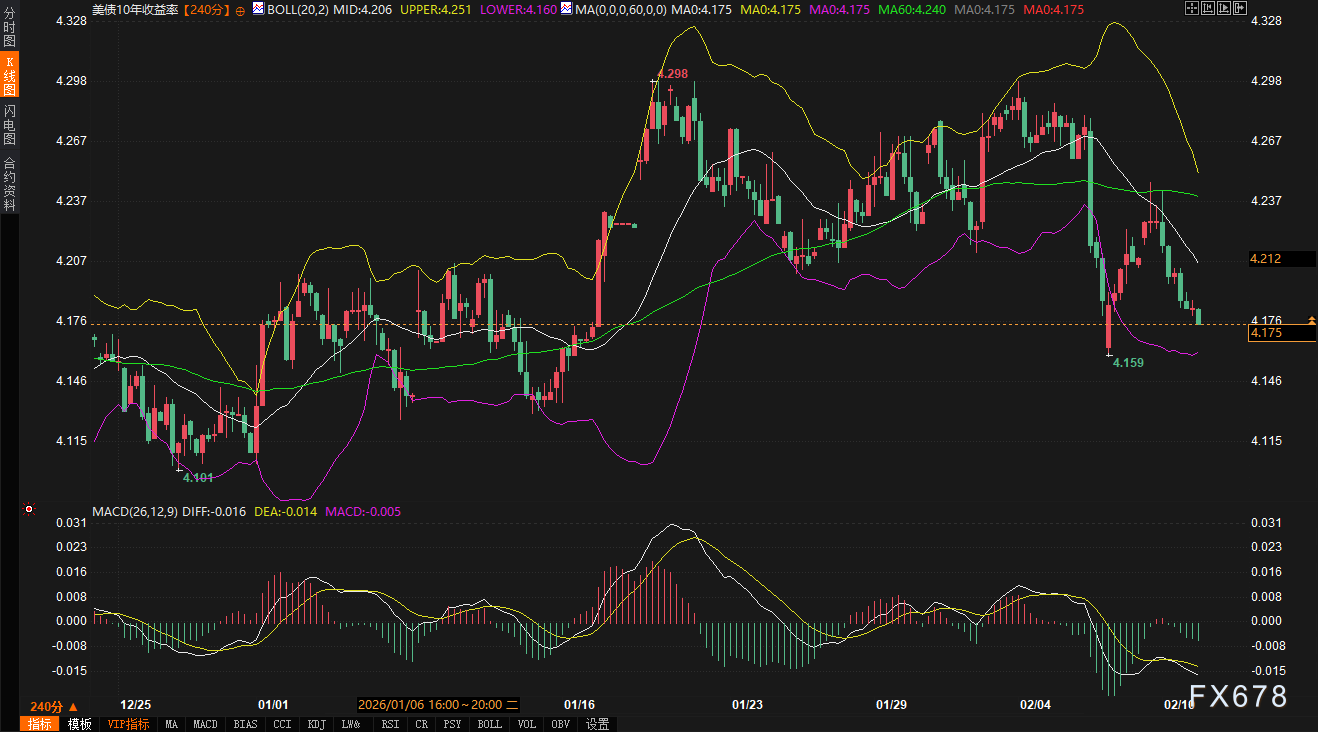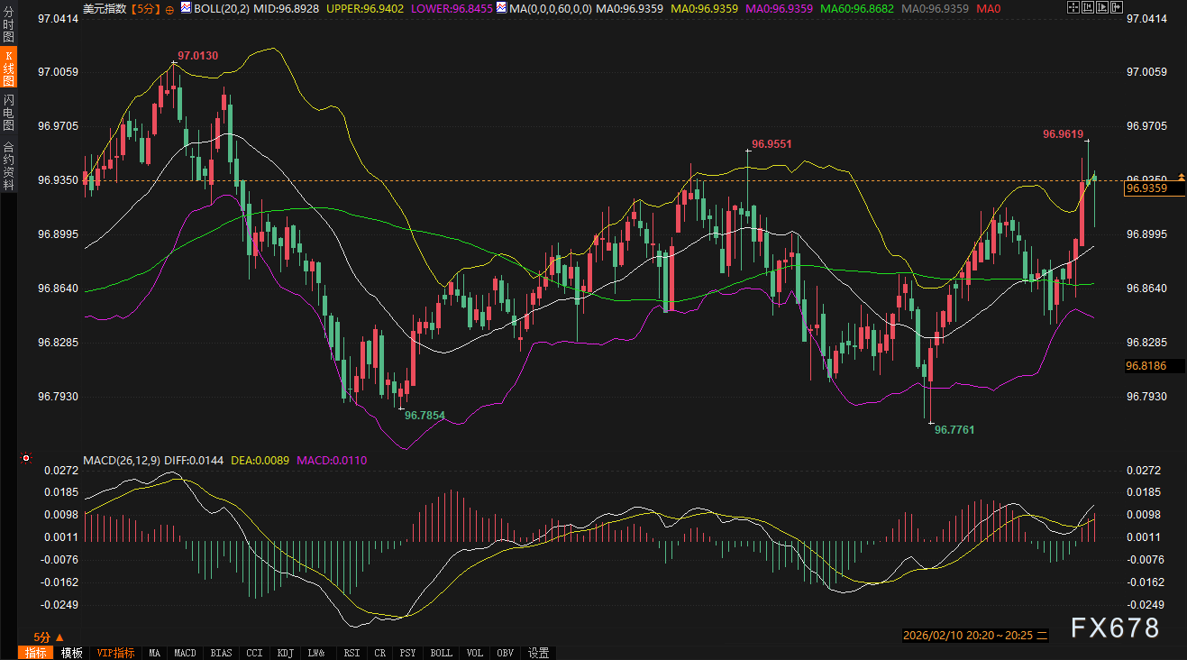 汇通财经APP讯——周二(2月10日),全球金融市场在关键经济数据公布前陷入典型的观望格局。美元指数于96.90一线维持窄幅整理,日内微涨0.02%,试图在周一回调后寻找新的平衡点。与之相对应,10年期美债收益率则延续回调态势,日内下跌0.62%至4.175%,债市呈现温和的“牛市趋平”走势。当前市场交投相对清淡,参与者正屏息等待本周稍晚的美国就业报告与消费者价格指数(CPI)数据,以获取未来利率路径的清晰线索。在这段数据真空期,美元的短期技术位与美债收益率的波动,共同勾勒出市场谨慎而充满张力的图景。